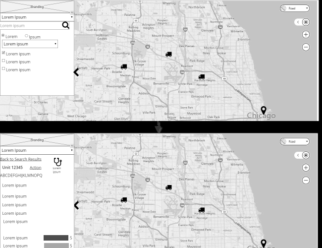 A logistics and software company had an existing web application that showed repair shops, hotels, and other places that are near a given vehicle. Executives tasked me with designing an experience for a new version of this mapping application. I spoke with the business analyst and developers, listening to their needs for the site and I offered modifications to those needs based on usability heuristics and my industry knowledge. For example, there was a need to visually track (live) a certain vehicle specified by the fleet manager.