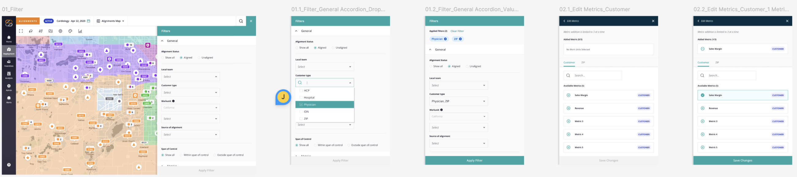 My work centered on designing and refining interactions for several core features, including the map-based filtering of representatives and territories. In each initiative, I began by reviewing initial requirements and holding detailed discussions with product managers and developers to uncover the rationale behind them. These conversations often revealed opportunities to streamline, add, or adjust requirements before moving into design. I then produced Figma wireframes and interactive prototypes to communicate proposed flows and behaviors, ensuring all stakeholders could visualize the solution before development.